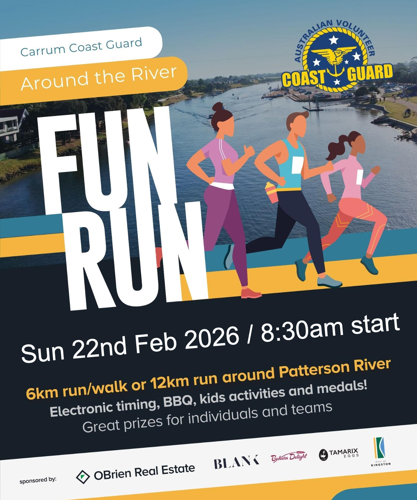 Come and join us for the 10th Annual Carrum Coast Guard Around the River Fun Run/Walk to be held on Sunday 22 February 2026. There are two timed events - a 6 km Run/Walk and a 12 km Run only.